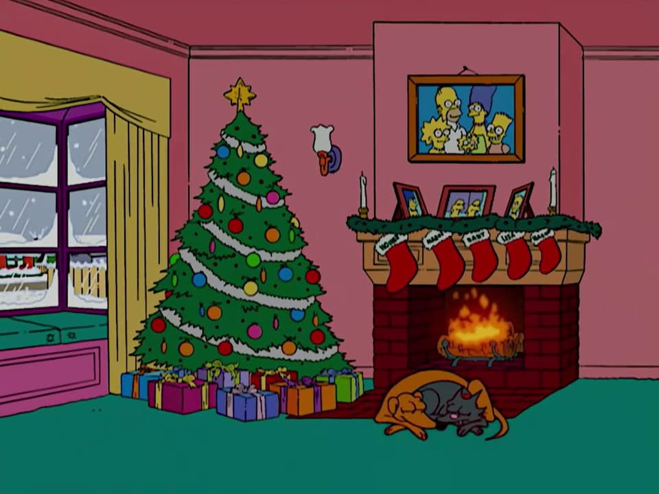 „Die Familie (in weihnachtlicher Kleidung) sitzt auf der Couch, und die Kamera fährt aus, um zu zeigen, dass sie sich in einer Weihnachtsdekoration befinden, die auf einem Weihnachtsbaum steht, und Knecht Ruprecht und Snowball II liegen in der Nähe.“