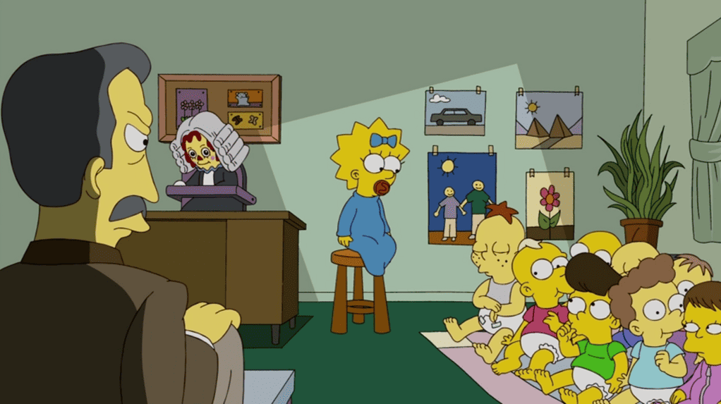 „Ein großer Marmorfelsen steht im Wohnzimmer, wo eigentlich die Couch stehen sollte. Ein stereotyper französischer Bildhauer meißelt schnell eine Statue der Simpsons heraus, die auf der Couch sitzt. Der Bildhauer verwandelt die Simpsons-Statue dann in die Statue eines Bürgerkriegssoldaten auf einem Pferd.“